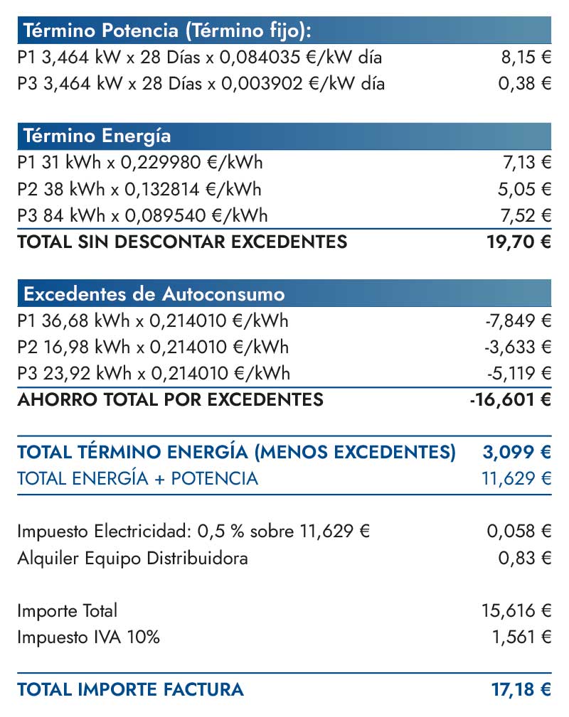 A continuación se muestra un ejemplo de una factura de un consumidor residencial con compensación de excedentes en la que el ahorro total sobre la factura supone un 49,14%: