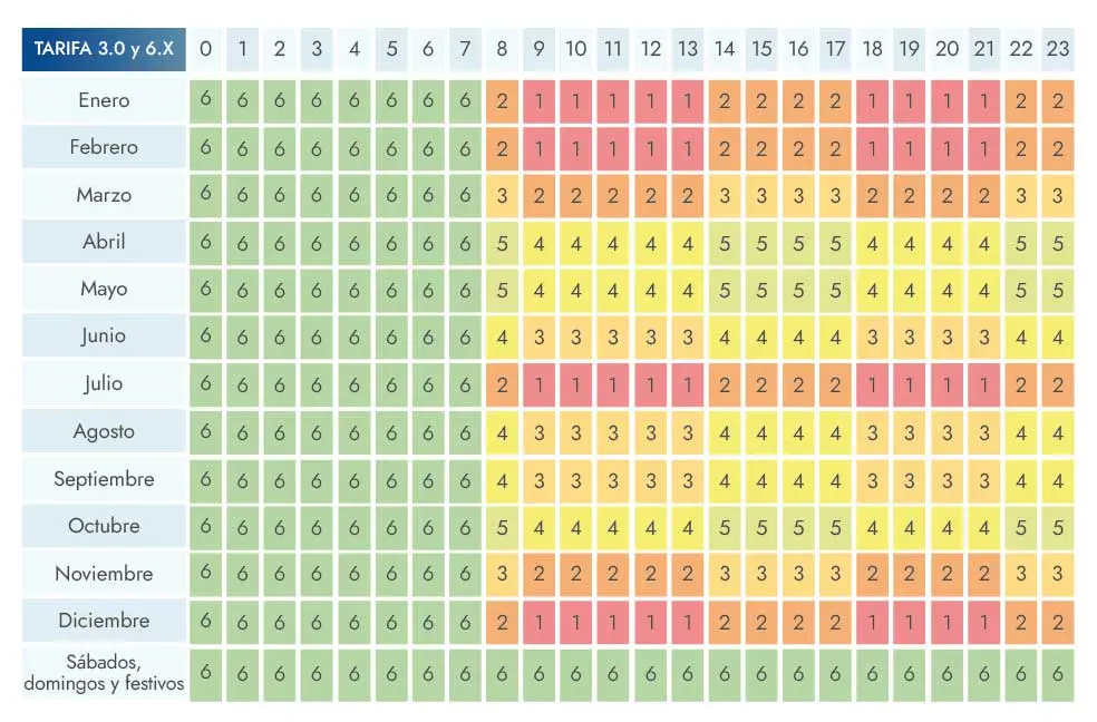 En las actuales tarifas 3.0A, 3.1A y 6.X, o lo que es lo mismo, en las tarifas 3.0 TD y 6.X TD, se establecerán 6 periodos de facturación tanto para energía, como para potencia, diferenciando entre cada mes del año y todos los fines de semana y festivos del año.