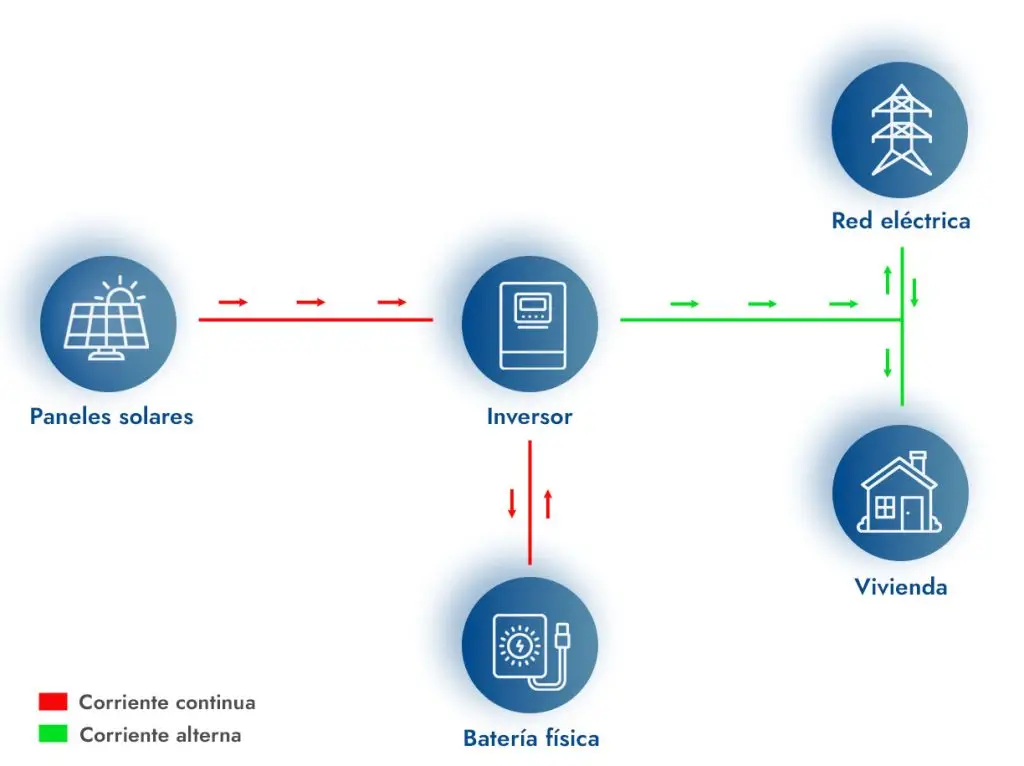 En caso de disponer de una batería física, el inversor pasará la corriente eléctrica continua directamente a la batería. Es decir, la conversión a corriente alterna no se produce hasta que se descarga la batería y se utiliza la energía en la vivienda.