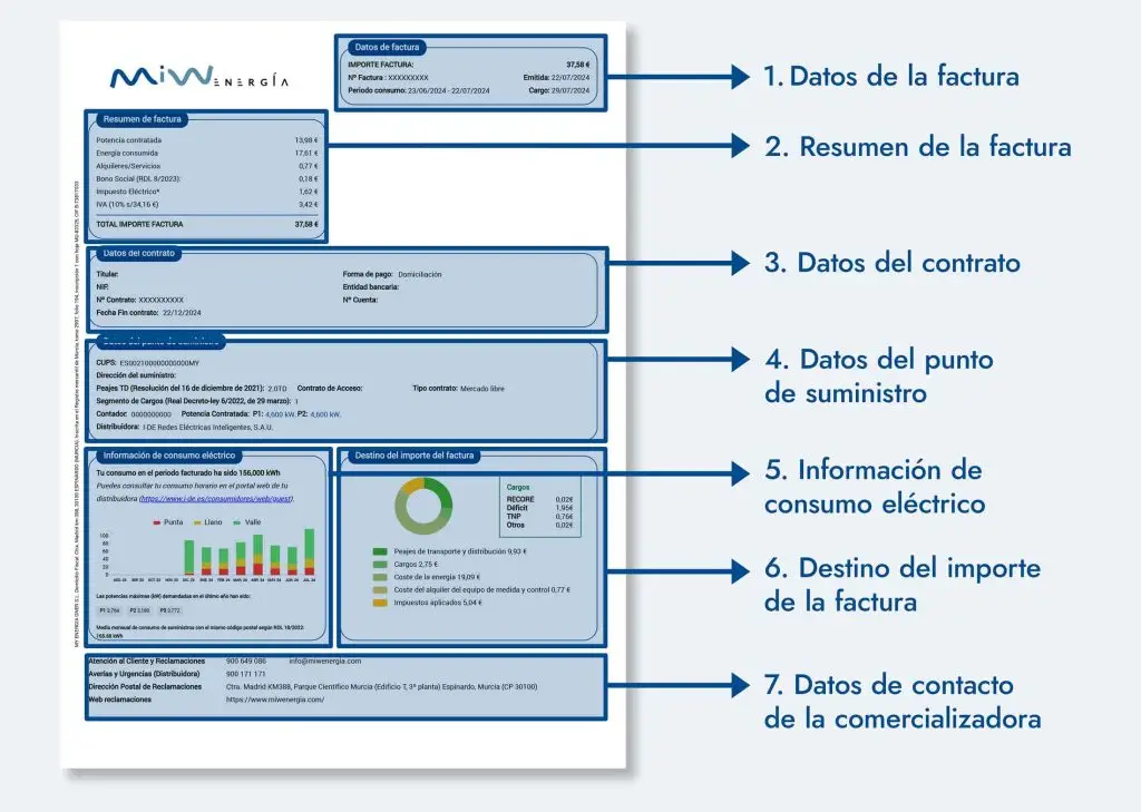 En caso de que tengas batería virtual, las partes de la factura de luz serán las mismas, aunque varían un poco algunas secciones al añadirse otros conceptos.
